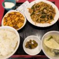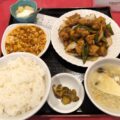 豚の角煮と野菜を炒めたものがメインで、マーボー豆腐の辛くない版みたいなもの、トマト入り玉子スープが付いてます。