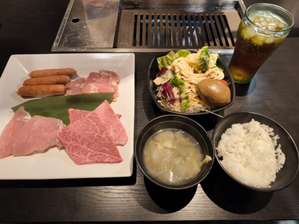 黒毛和牛焼肉ランチと言っても牛は1種類だけで、残りは豚と鶏、ソーセージです。