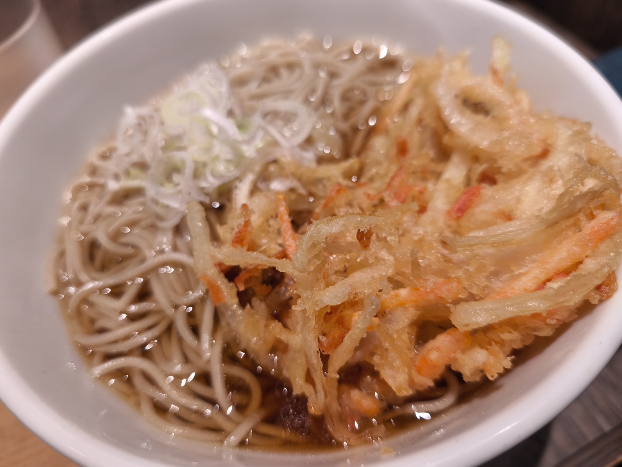 かき揚げ、パッと見は玉葱と人参だけに見えてショボいかと思ったけど、かなり小さいけどエビも入っていてかなり美味しい。