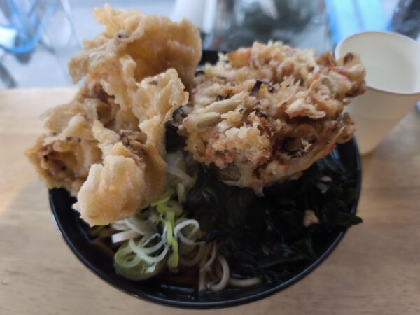 二度と来れない(機会がない)かもしれないので、欲張って蕎麦の大盛りにゲソ天と五目かき揚げ天を。