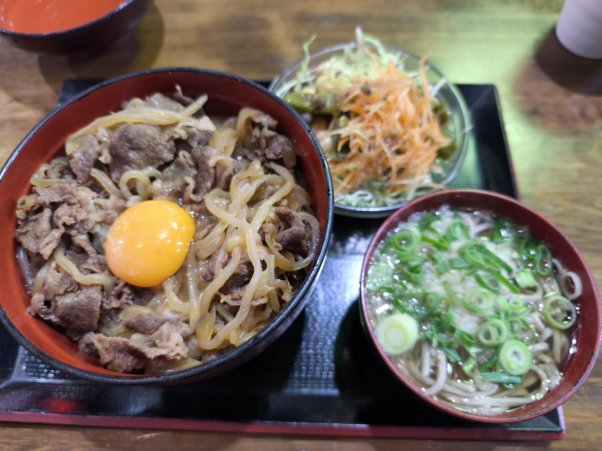 たぶんここはうどんがウリなんでしょうけど、メニューを見ていたら「宮崎牛を存分にご堪能下さい!」なんて書いてある割にお値段もソコソコな牛丼が気になって、蕎麦のセットで頼んでみました。