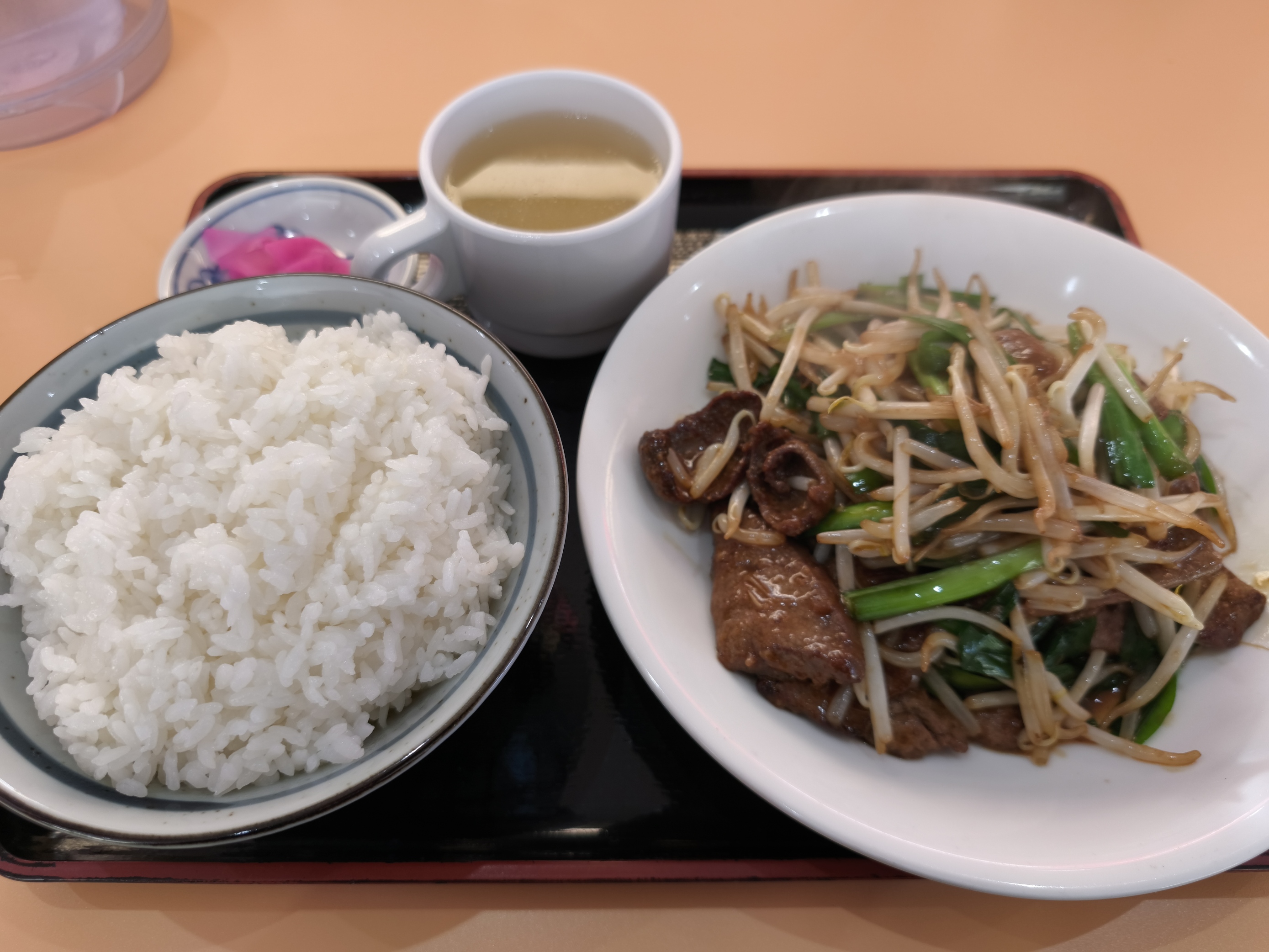 こちらは生姜焼き丼がとにかくすごいボリュームで有名らしいので頼もうか迷ったんですが、ビビってニラレバ炒め定食を。