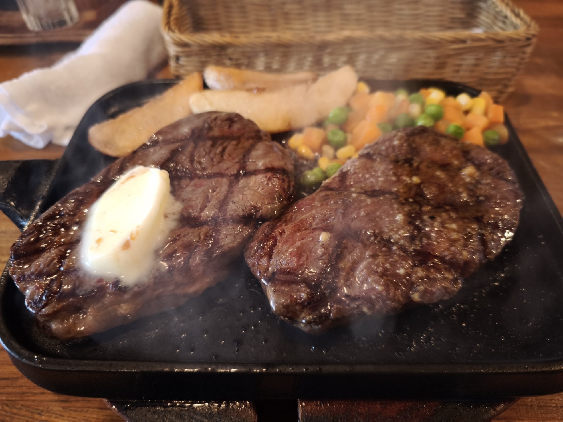 アメリカンステーキ単体と迷ったのですが、久し振りにお腹が鳴るほどちゃんと?空腹だったし、初めてなので2つの味を試してみようとアメリカン・ガーリックのW(2枚)ステーキをミディアムレアで。