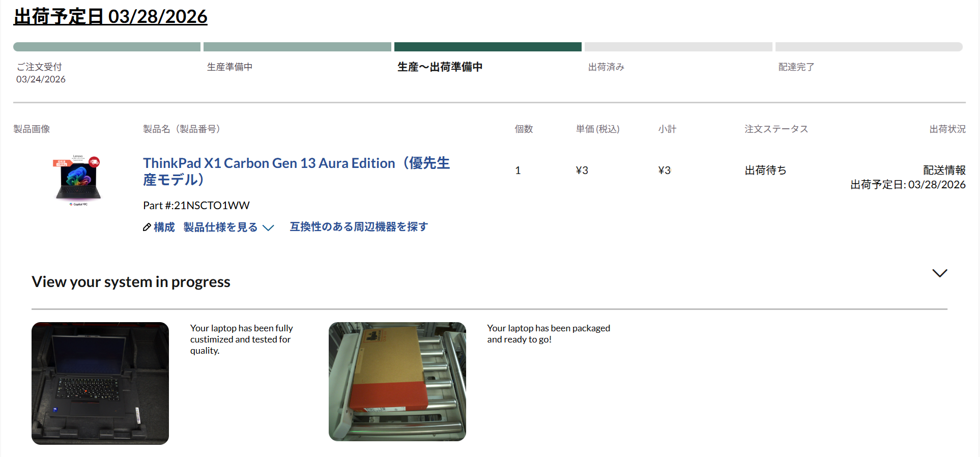 しかし今のレノボのサイト、注文状況を確認すると、”カスタマイズとテストが行われました”とか”パッケージされて出荷待ちです”とか、画像とともに表示されます。
